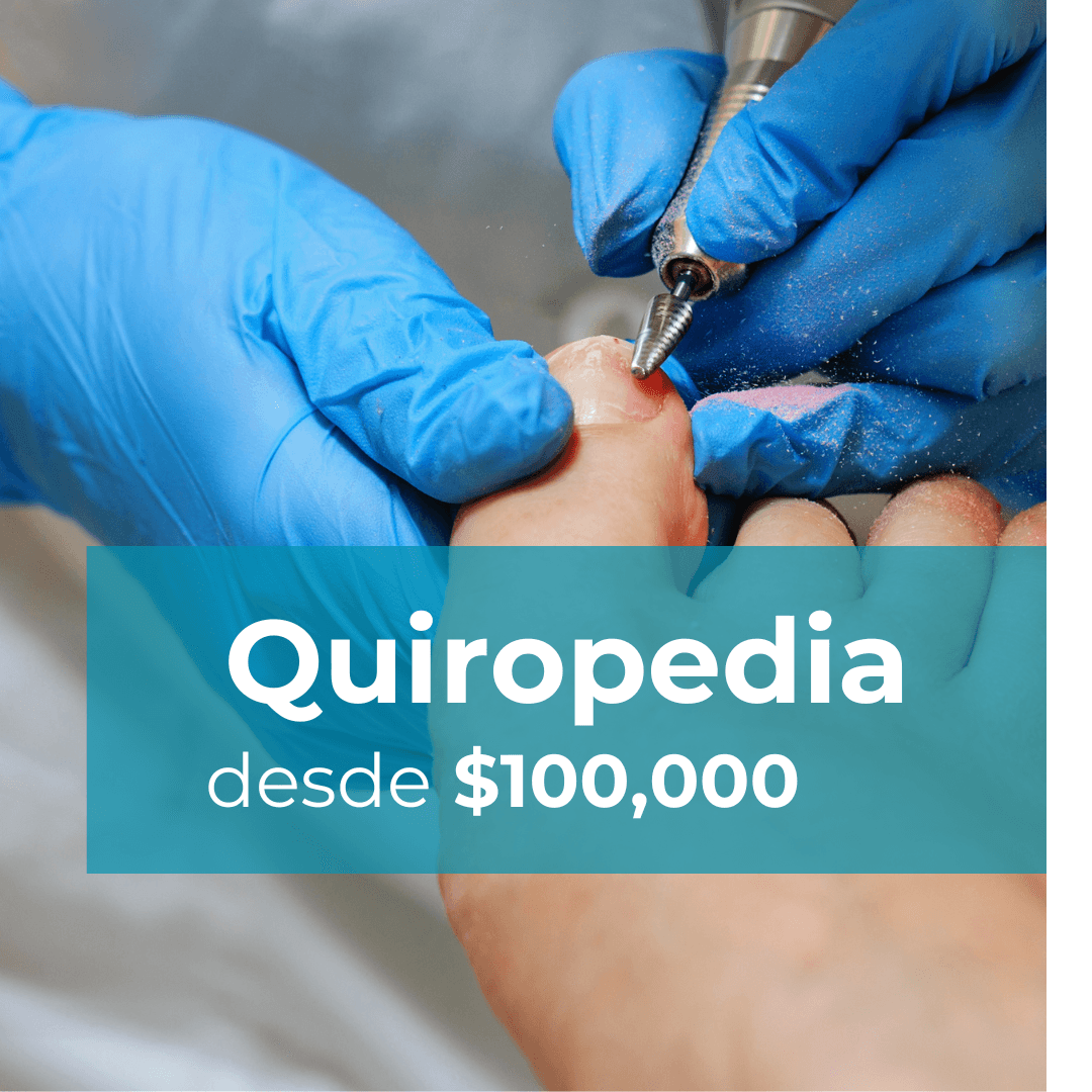 Pedicure medico o quiropedia es un procedimiento de profilaxis profunda, donde se realiza el corte correcto de uñas, limpieza de canales, se retiran callosidades las cuales se pulen e hidratan por medio de un masaje vigorizante podal. Este procedimiento se realiza con instrumentos quirurgicos 100% esteriles. +Masaje vigorizante +Barrido Ungueal